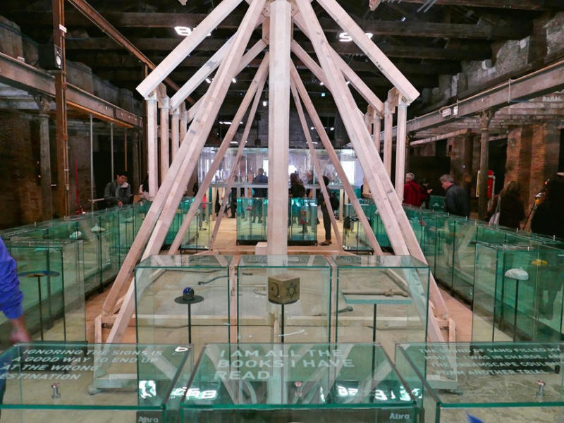 At this years Venice Biennale, the Indonesia pavilion featured an interactive narrative titled Lost Verses. The room was filled with class cases, whose tops were printed with one part of a fragmented story and a number, and contained objects inside. Each case gave possibilities for the next case for the viewer to visit.